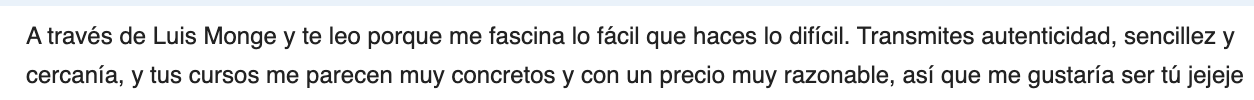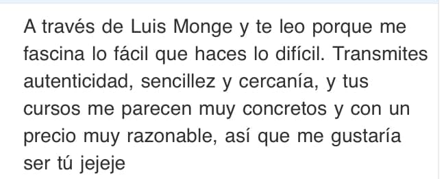 Me encanta la manera como explicas las cosas. Lo haces muy sencillo para que la gente no pueda dejar de seguirte. Sabes aterrizar muy bien los conceptos aparentemente complejos para que la gente los entienda. Y lo haces de una manera atractiva, tanto cuando escibes como cuando explicas en los cursos. Otro punto clave es que siempre hablas desde tu propia experiencia, y eso no sabes la confianza que genera.